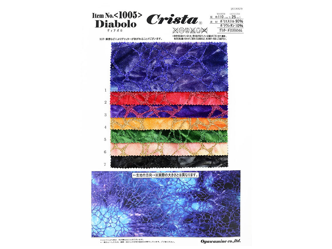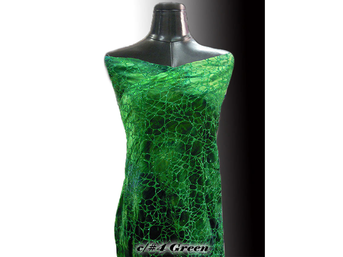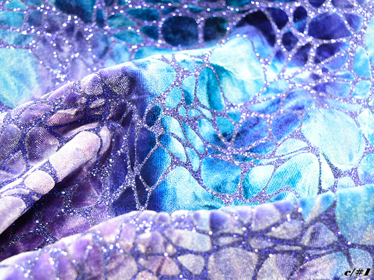 絞り染めベルベット素材に、存在感のあるランダムメッシュ柄のラメグリッターを加工しています。