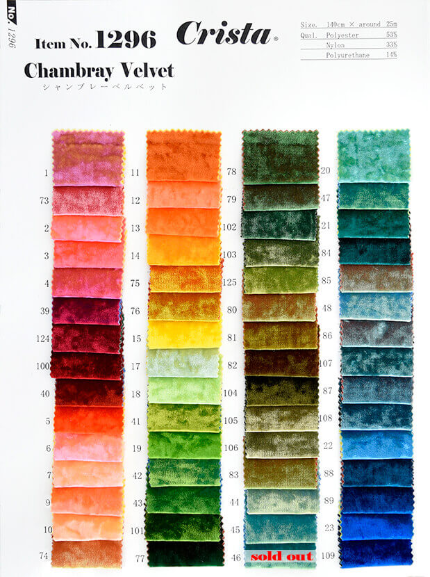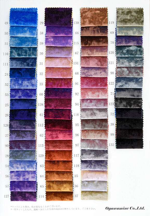 特殊な染色により角度によって色の見え方が異なる、深みのあるシャンブレータイプの2WAYベルベット素材です。※こちらの商品はシャンブレー素材により画像での表現が難しいため、サンプル帳や現物での確認をお勧め致します。 サンプル帳MB2-161-1296
