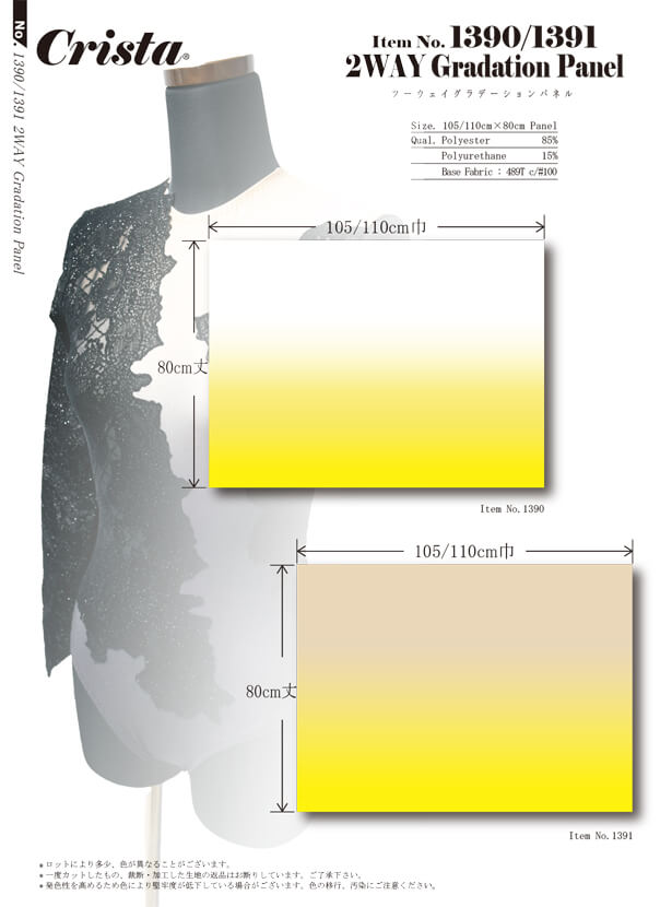 80㎝丈の生地領域で、白→カラーへ縦グラデーションを施した素材です。レオタード・袖・スカートにもグラデーションの魅力をご堪能いただけるアイテムです。ライクラ生地。オーソドックスなレオタード素材となります。