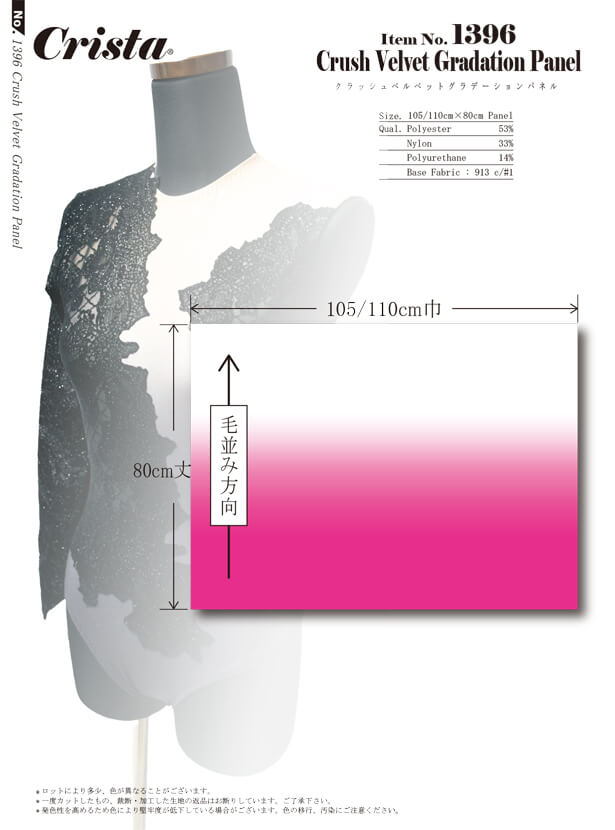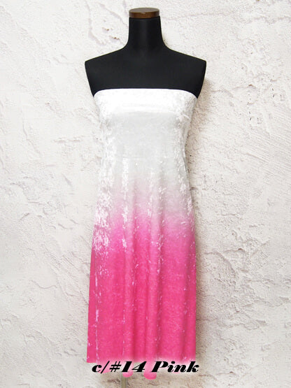 80㎝丈の生地領域で、白→カラーへ縦グラデーション(逆毛方向)を施した素材です。レオタード・袖・スカートにもグラデーションの魅力をご堪能いただけるアイテムです。クラッシュ感のあるストレッチベロア素材です。
